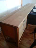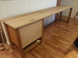 Armed with my drawings and sketchup, I spent a small fortune on wood (though still a little less than three 24″ Dell monitors cost) – cedar for the top (and drawer fronts I ended up replacing), and maple for the legs, lower shelf and rails. I chose cedar because it’s a softwood and hence relatively light for the distance travelled (the jarrah used on my previous project made it heavier than it looked – even the removalists commented on it), and maple as something different to the arguably too common (though cheap and effective) radiata pine.